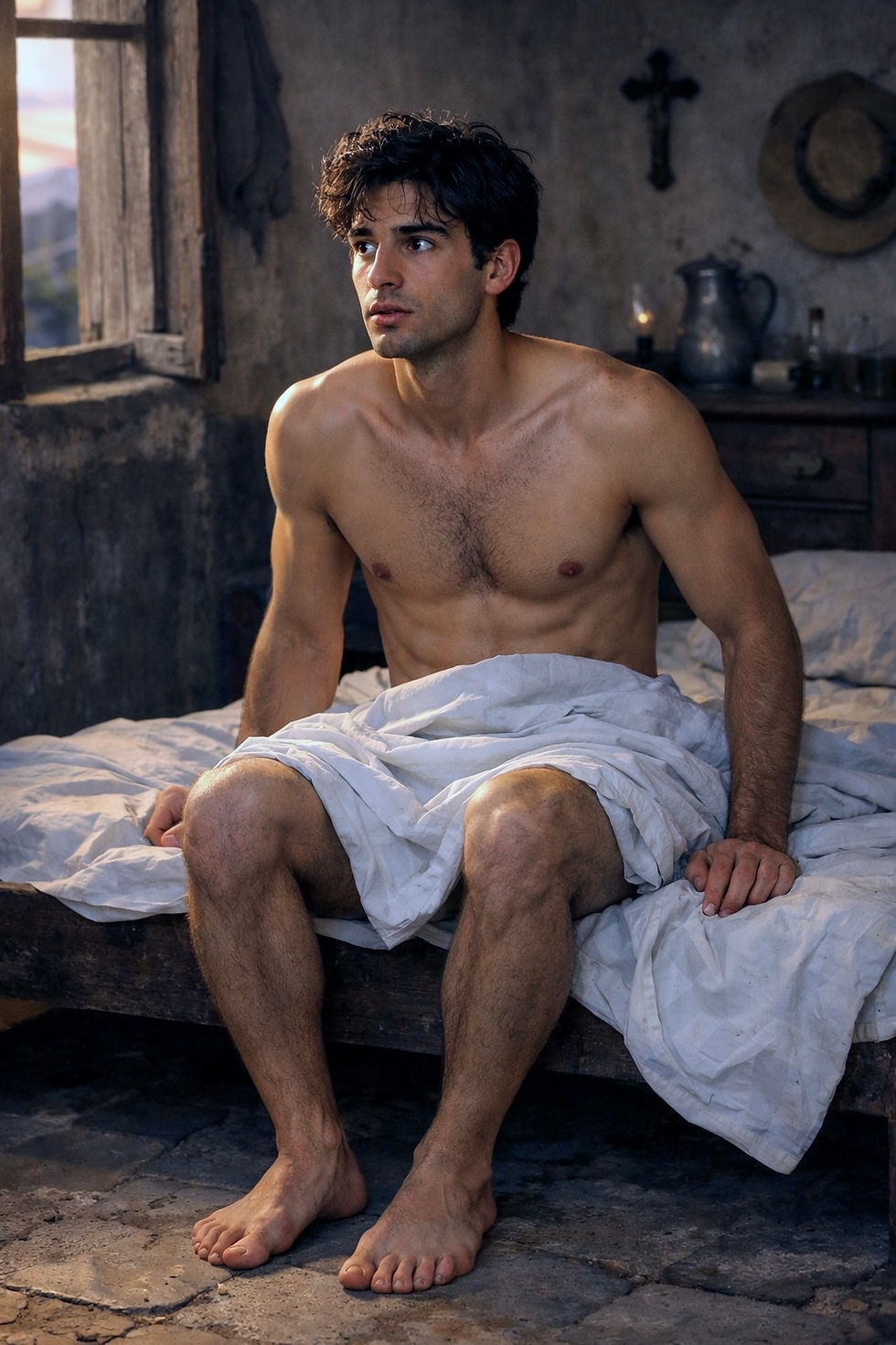 Giorgio stepped out. Barefoot. He wore those loose beige trousers I had come to know, his upper body bare. The early light lay across his skin, tracing soft lines over muscles and veins that were not made for beauty, but for work.